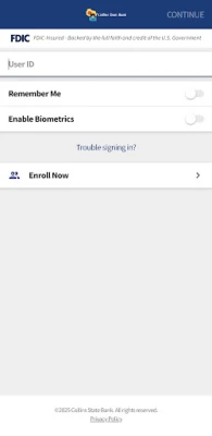 Start banking wherever you are with Collins State Bank Mobile for Android! Available to all Collins State Bank online banking customers Collins State Bank Mobile allows you to check balances, make transfers, and find locations. Need to find a Branch or ATM closest to you? With Find Near Me, Collins State Bank Mobile will discover your location and provide you with addresses and phone numbers on the fly.