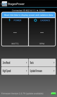 Maximize your Stages Cycling Power Meter performance. Utilize the app to quickly display power and cadence values, perform a zero calibration to ensure accurate measurements, and update the firmware with the latest features and functionality.